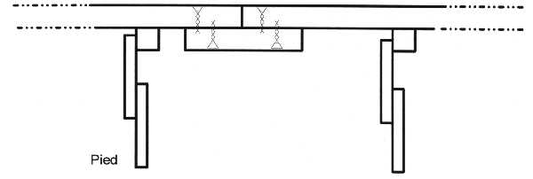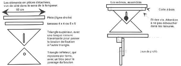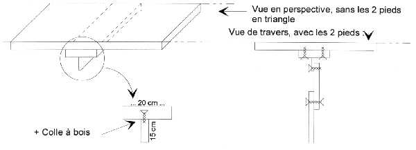 | Détail de la fixation du triangle supérieur du pied au dessous de la piste. Le tasseau est collé et vissé sous la piste. Le pied est boulonné au tasseau : |