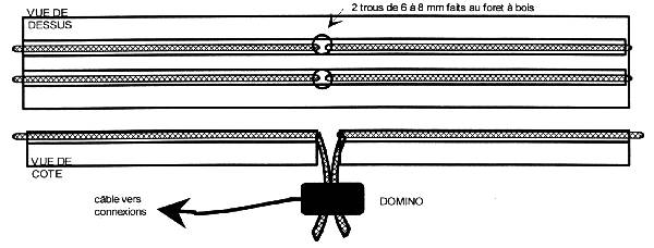 | Lors de la pose de la tresse, vous avez pris la précaution de laisser dépasser régulièrement 10 cm sous la piste (une fois tous les quelques mètres). C'est là dessus que l'on va s'accrocher avec de gros dominos pour amener le courant : |