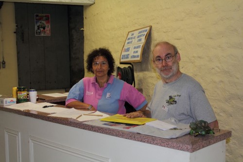 ![]() /Marianne & Fred discussing strategy with mascot Turtle. /Marianne & Fred complotent au bar avec la tortue mascote. |