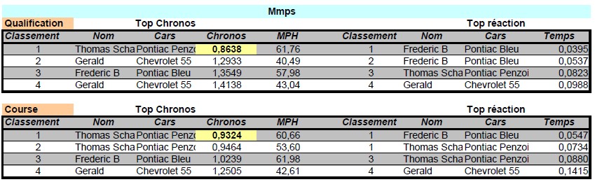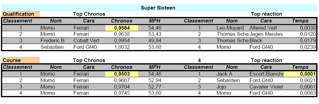 Classement des 4 premiers de chaque catégorie avec les chronos et temps de réaction :